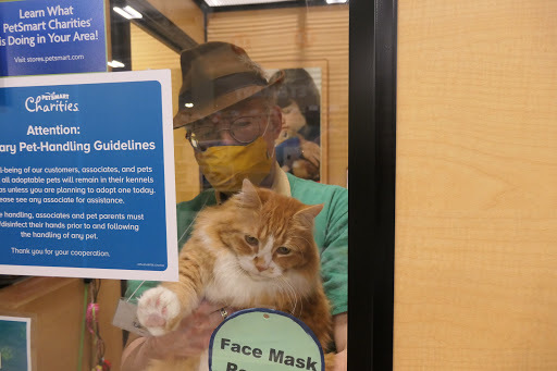 So, a dozen cats in all. First things first, so I got the leash on TIKA and took her out. She didn’t seem to enjoy herself much, but still think the change will do her good in the long run. She mostly sat on the half-high cat stand outside the room and watched everything go by. I also carried her about some. Next came KINDA, who did his usual explorations all over. He got some good comments by staff and customers alike. When he (reluctantly) went back in I put him and his sister back in their cage. Whoever recommended the blanket blocking their vision from the rest of the room was right: both settled down and didn’t do any hissing or growling aimed at the other cats that I heard.