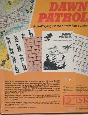 What's really interesting about DAWN PATROL is that it had an independent existence before and after TSR. In fact, the game sold by TSR as DAWN PATROL was the 7th edition of a game previously known as FIGHT IN THE SKY. Inspired by the 1966 movie THE BLUE MAX, game designer Mike Carr** created a World War I flying combat game which has the distinction of being the only game played at every GenCon --or so I was told when I got to play the game in the early '90s, guided through the rules by Skip Williams. I thought this was at GenCon, but having just turned up my character sheet ('rank novice') from a game on Friday January 7th 1994 I think it must have been at Winter Fantasy instead.