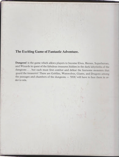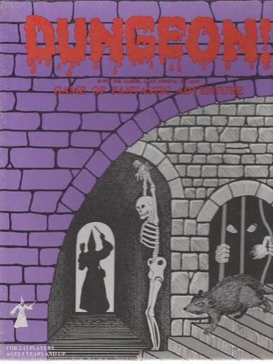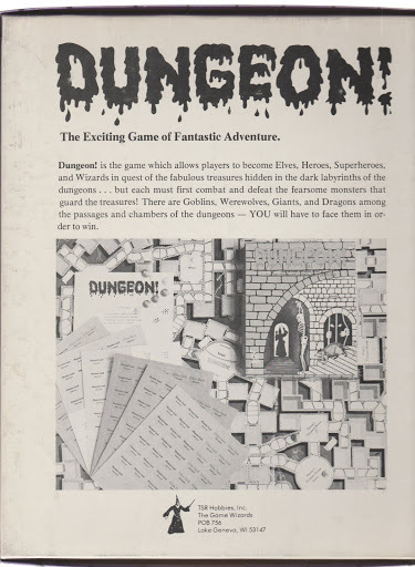 So, perhaps the most successful TSR boardgames of them all was DUNGEON, the creation of Dave Megarry,* which went through at least six editions, the earliest as far back as 1975 (the year after D&D itself debuted) and the most recent almost forty years later in 2014. Part of its longevity was no doubt due to its conveying the feel of a dungeon crawl. This must have made DUNGEON a godsend to those who wanted to play D&D but cdn't find a DM or reliably put together enough people to form a PC party.