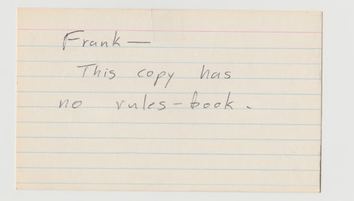 My copy has the game board, which someone has carefully marked up, apparently to show production what color goes with each space. Also in the box are the cards, pawns, and dice. There's no rulebook, but there is the following intriguing note in with the other components: