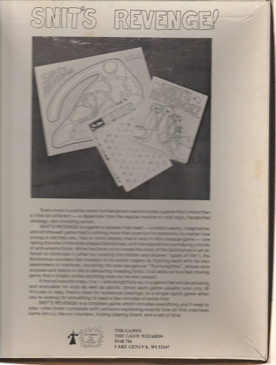 Wham was also exceptional in that most of TSR's early boardgames were one offs, the only boardgame TSR produced for that author. By contrast Wham created a number of such games. There was not only SNIT'S REVENGE's predecessor (SNIT SMASHING) but also its successor (RUNNGUS'S GAME).