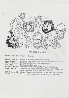 So, this might be a little easier: a group drawing of the folks in Harold Johnson's product group in Spring 1997: post-layoff and pre-WotC. This full page version includes the names of all nine designers and editors, along with (I assume) the lines they were working on.