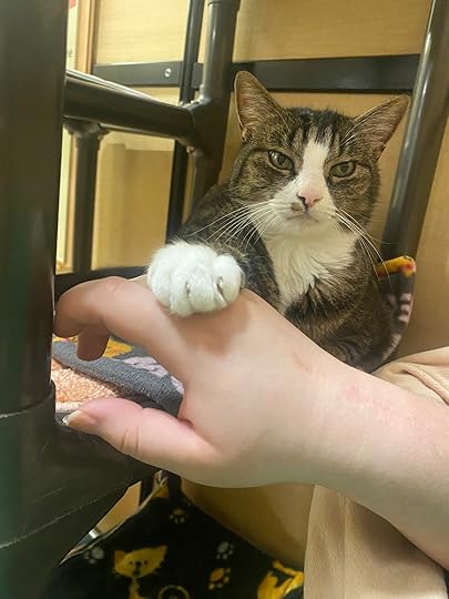 The cat room now has three cats: senior cat Bettie Boop, who tends to toggle between wanting affection and acting grumpy. She thought about coming out several times but ended up staying in all shift.