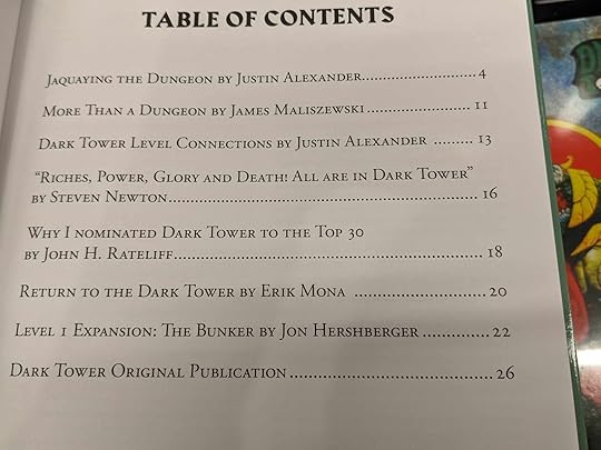 So, one of the things I saw at GaryCon that interested me greatly was the new expanded edition of DARK TOWER, by the late great Jennnell Jaquays. Not only is this one of the great modules from the early days of D&D, but I'd contributed a short note of appreciation to this new edition. I won't repeat here what I said there, so I'll just reprint the Table of Contents to give an idea of what the frontmatter is like.