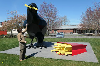 On the drive out while passing through Auburn we'd sadly noticed that Proper British Bacon, the shop where I got all my English cheeses, has indeed shut down -- for good, not just the duration of the present crisis. But we also spotted the giant statue of a crow, which we made a point of pulling over on the way back to get a closer look at it. I really liked it. The sculptor's name is Peter Reiquam, and I liked how he not only made an eye-catching and appealing image but clearly knows his stuff. Not only are crows fond of french fries (their favorite scavenged fast food) but they've been proven to have brand loyalty. Given a choice, they go after McDonald's over other brands of fast food french fries --and while the logo is discreetly missing the coloring makes it clear it is indeed McDonald's.