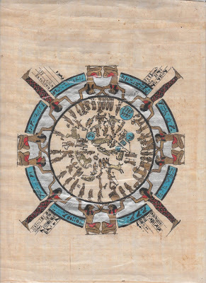 So, our schedule for this day of the trip, had all gone according to plan, would have found us starting the day at Dendara with a visit to the Temple of Hathor (previously home to the famous Zodiac of Dendara). The zodiac is now in the Louvre but here below is an image of it on a piece of papyrus I bought years ago (I think in a little shop tucked in a corner on the bottom level of the Pike Place Market) -- partly because I wanted to see what a real, if modern, piece of papyrus looked like and partly because it was a striking image of an interesting piece.