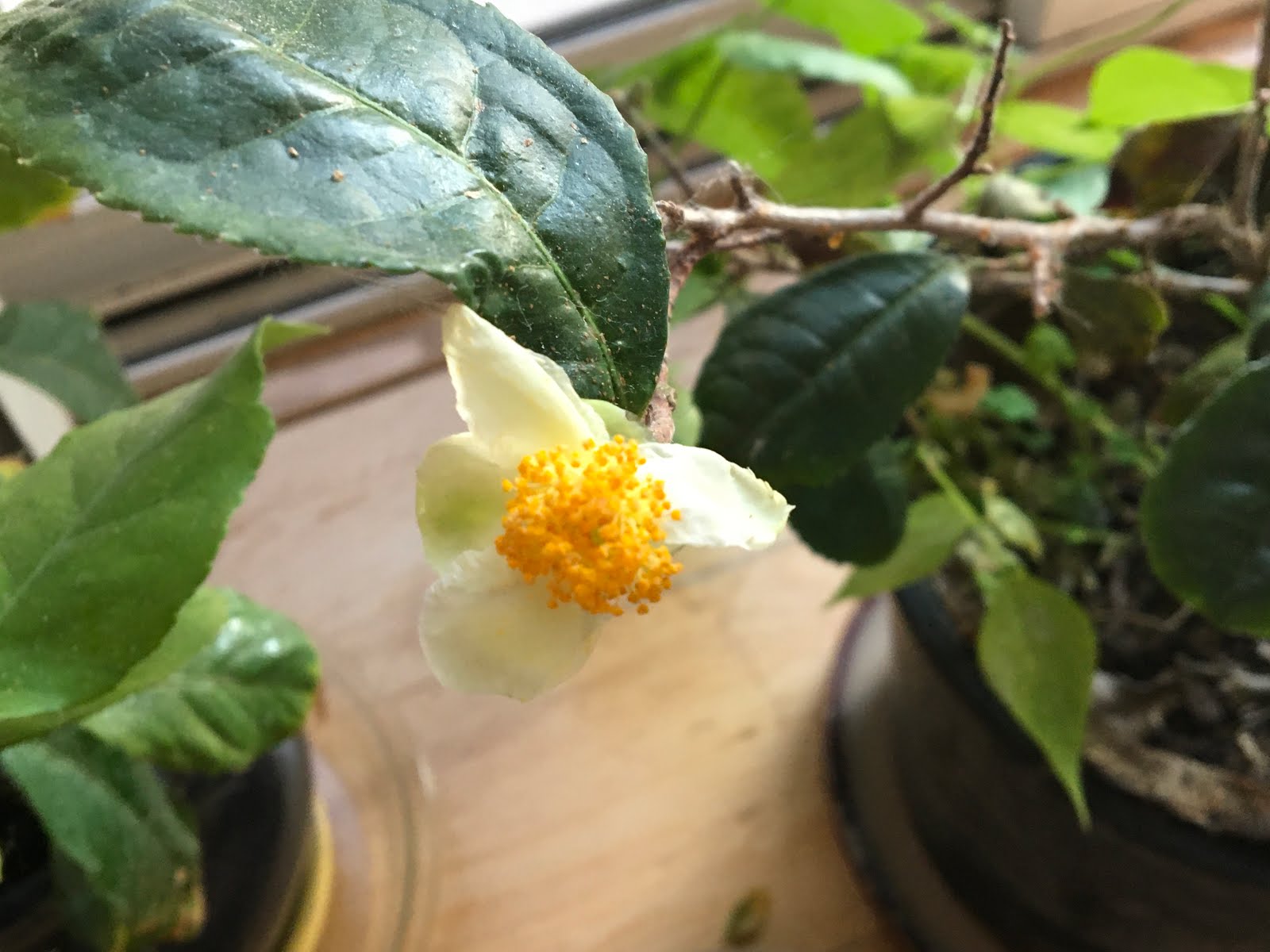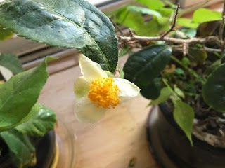 And that includes tea trees, which are a specialized kind of camellia. Here's a picture Janice took of a tea blossom on one of our two little indoor tea plants.