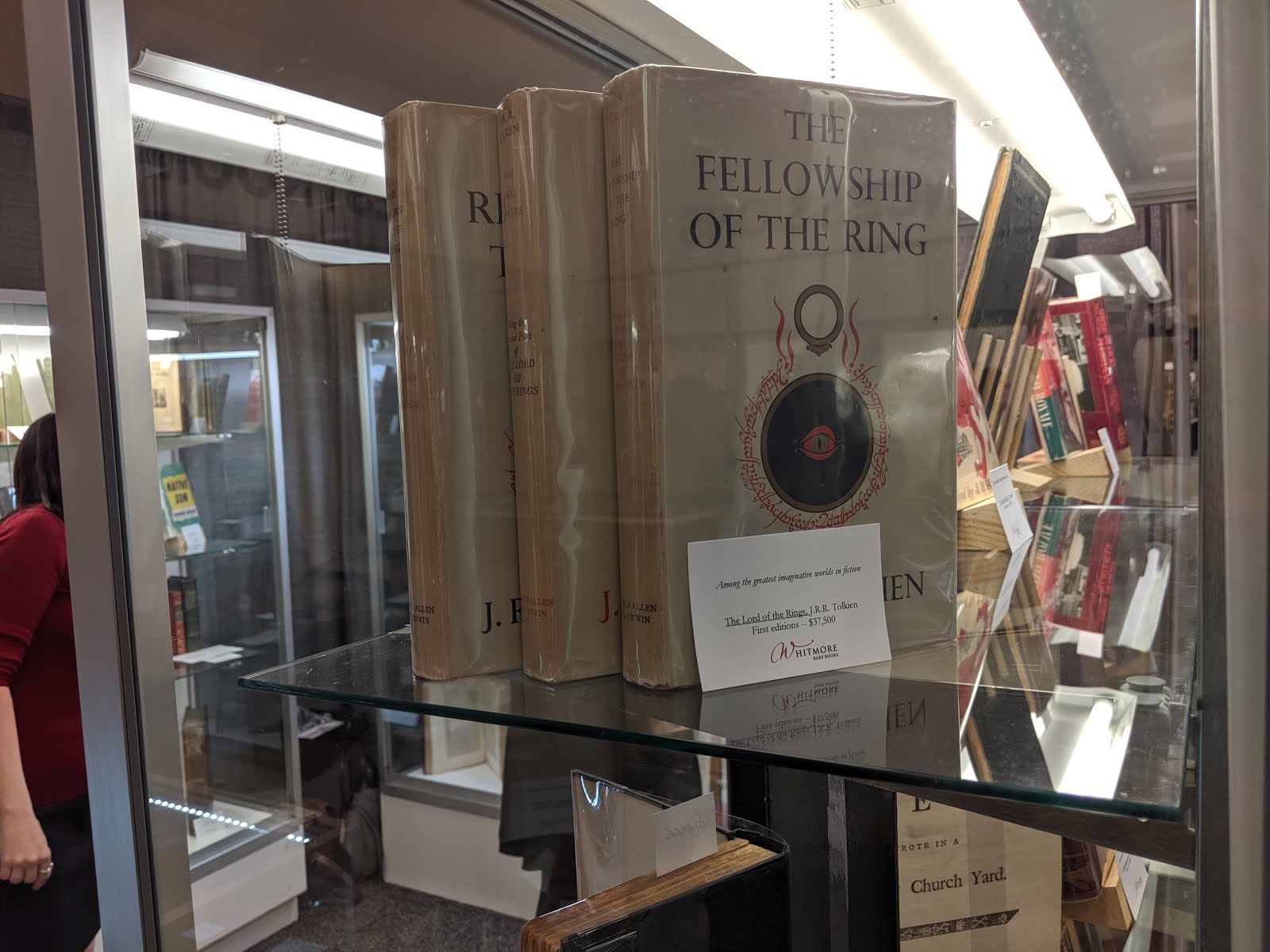The best thing about the Book Fair is that you can find interesting books at reasonable prices if you were looking for good reading copies, as well as rare and famous books priced accordingly. For example, they had a copy of a first edition of Poe's THE RAVEN for $15,700. It's rather surprising that there was a three volume first edition LotR in really good original dust jackets for more than double that: $37,500. And these were not signed or inscribed or associational copies: just attractive copies of a much-in-demand book. When the bookseller granted permission for us to take a picture of them, she cheerfully pointed out they were displayed at the most prominent attention-getting spot in the booth for a reason.