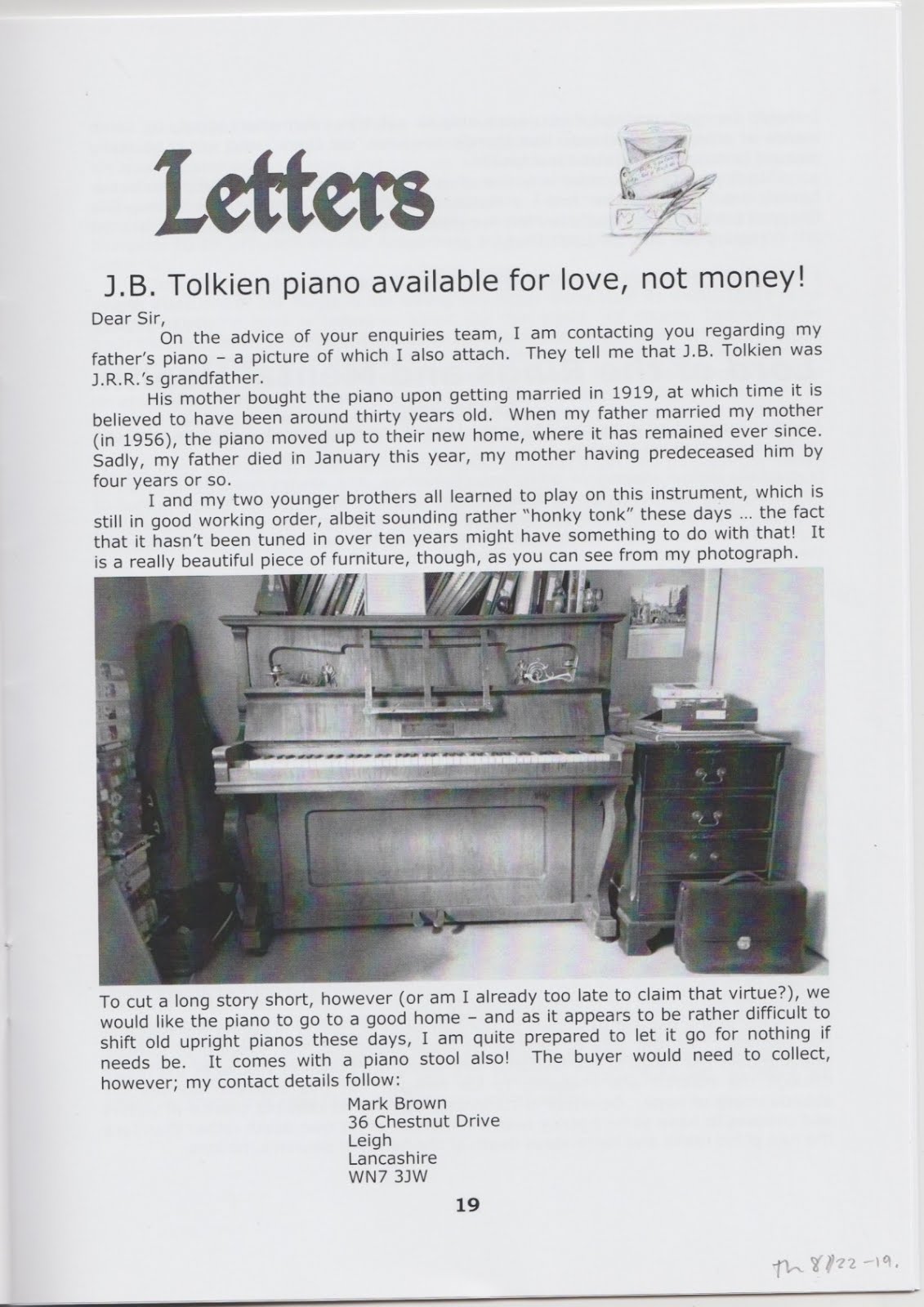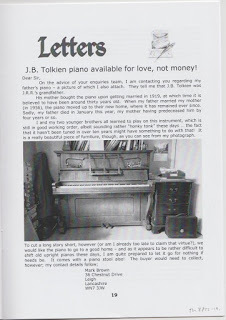 And now it appears that total of known surviving Tolkien Pianos has increased to two. I was skimming through the latest issue of AMON HEN when I saw the following notice about someone who had a Tolkien piano, complete with stool, that'd been in his family since 1919, having been made about thirty years before that. And, in an act of stunning generosity, he wanted to give it away to a good home. Here's his picture of the piano in question: much less utilitarian and more elegant than I had expected.