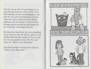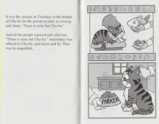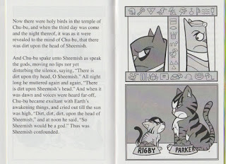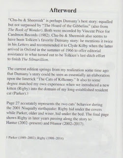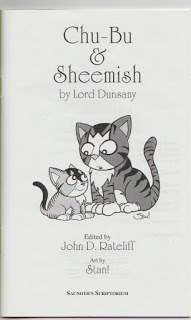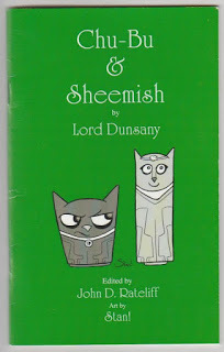 So, a few years back Janice created as a gift to me a little booklet, illustrated by our friend Stan!, telling the story of our cat Parker, aka The Cat Who Bit People. It was called PARKER'S CHRISTMAS ADVENTURE and might best be described as 'based on a true story'. I've wanted to return the favor, and a while back fixed on what I thought we be a good medium: a booklet that told two stories at the same time. On the left-hand side of each spread are a few paragraphs from Lord Dunsany's short story "Chu-bu & Sheemish",* illustrated in the top register of the facing right-hand page. The bottom right-hand register tells the story of Parker coping with the addition of another cat, little Rigby, to the household.