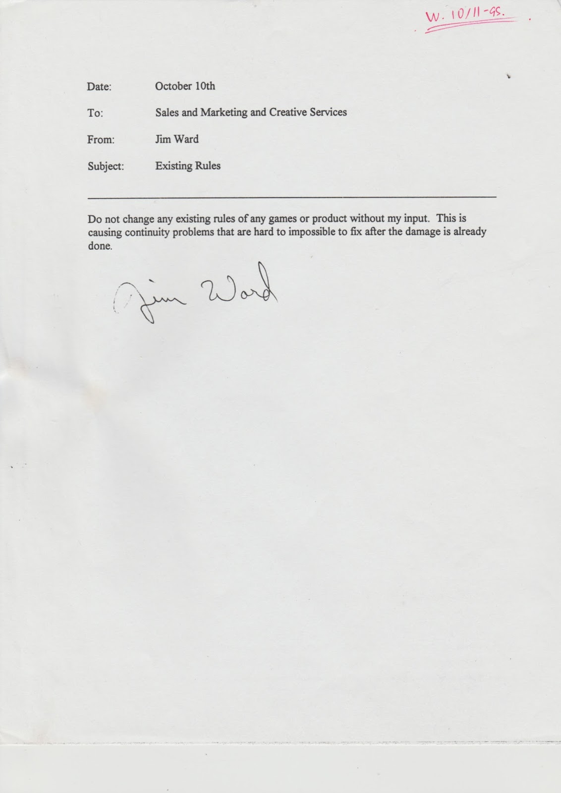 For those who can't see the image clearly enough, it's from Jim Ward, addressed to Sales & Marketing and Creative Services, dated October 10th [1995], with the Subject line 'Existing Rules'. The full text of the brief memo is as follows: