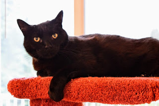 Our other new cat (new to me anyway), OBI, may have been asking to go out on previous shifts, but he had second thoughts once actually out there. He got spooked by store racket (bad luck there) and climbed up to perch on my shoulders. Each time I got him down, he went right back up again, so I wound up cutting his walk short. While we were waiting for an employee to bring a key he lay down in front of the room, where he welcomed petting from three little girls (the oldest of whom was seven).