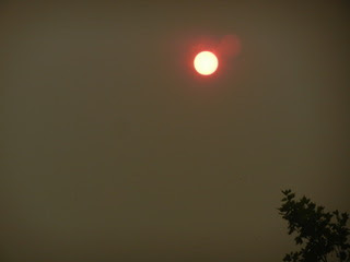 Then yesterday morning the sun was odd too: distinctly red, and casting red sunbeams early in the day. By mid-morning we were getting yellow sunbeams out of a white sky. Over in Des Moines (the Seattle suburb, not the city in Iow[image error]a) the sun looked more like the design on the New Mexico flag, except a-symetrical.