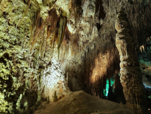 from the ceiling, and towering stalagmites thrust up from the floor of the