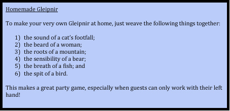The gods appealed to the smithy dwarves to forge something impossible to break. They fashioned a ribbon-like shackle called Gleipnir, woven of impossible items (see recipe, below). Fenrir, suspecting a trick, refused this challenge. The gods pinky-swore to release Fenrir if he couldn’t break out.