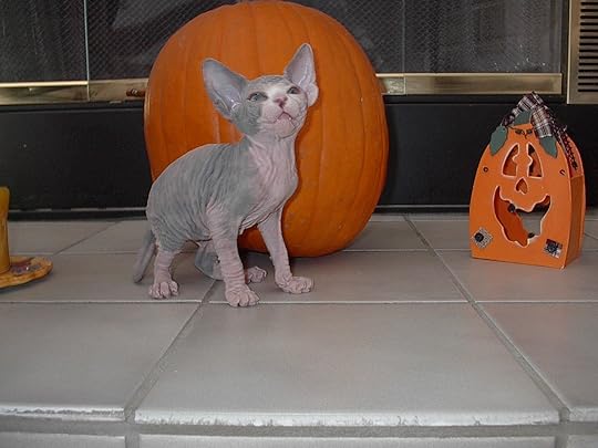 Nikita is our female Sphynx cat. This photo was taken several years ago in October, the day we first met. She is wearing her Halloween costume…a pair of saggy skin pajamas. She likes this costume so much she wears it all the time now. Good thing it's wash and wear.