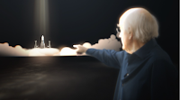 Nowhere is this more starkly evident than in Episode 5, where Burke discusses the usefulness of the vacuum flask. He makes his case then turns and points behind him, as in the screenshot above. We get a CGI animation of a rocket blasting off - a fun gag and call-back. In the original, out on location and perfectly timed to the launch of the Titan-Centaur rocket carrying Voyager 2 in space, it creates an iconic bit of TV: