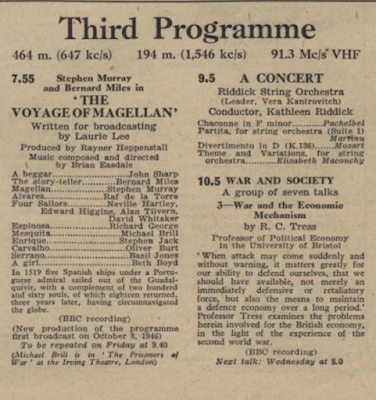 Sadly, the BBC's Written Archives Centre (WAC) in Caversham does not hold paperwork relating to The Voyage of Magellan to give us more information, such as whether it was first broadcast live or recorded in advance. Details of this and any other roles David might have had on radio are not included in the "radio contributions" files for David held by WAC, which instead cover writing work he did for television outside his staff job.