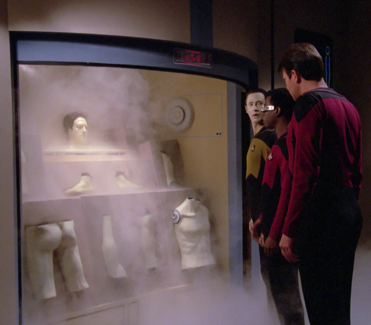 Anyway, Wes, Troi and Georgi are the three people Data trusts enough to confide what he’s been up to: making himself a child. This he presents as a fair accompli rather than at 12 weeks, directing our attention to an odd-looking small person in a machine. The being has neither clothes nor gender, but Data is clear that this is, “my child” and calls the process “procreation”. Apparently, this new project - and progeny - is the result of Data having just been at a cybernetics conference where a “new submicron matrix transfer technology” was introduced that Data “discovered could be used to lay down complex neural net pathways … I realised for the first time it was possible to continue Doctor Soong's work.” No one else has been able to make this leap because it needed Data to transfer stuff from his own brain into the child. For reasons we’re not given yet, and which no one asks at the time, Data has named his child “Lal”.