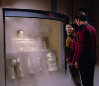 Our heroes report the matter upwards to Picard, who is not does not delight in the news. Yet, as Data tells his captain, no one else on board is required to ask permission to procreate. There’s an implicit, insidious question over Data’s right or worthiness to have children, a moral judgement based solely on the fact that for him procreation is more complex than a fuck. It brought back the cruel interrogations the Dr and I went through during IVF and adoption. Anyway, Picard’s response is in stark contrast to the position he took in 2.9 The Measure of Man - just note his use of pronouns: