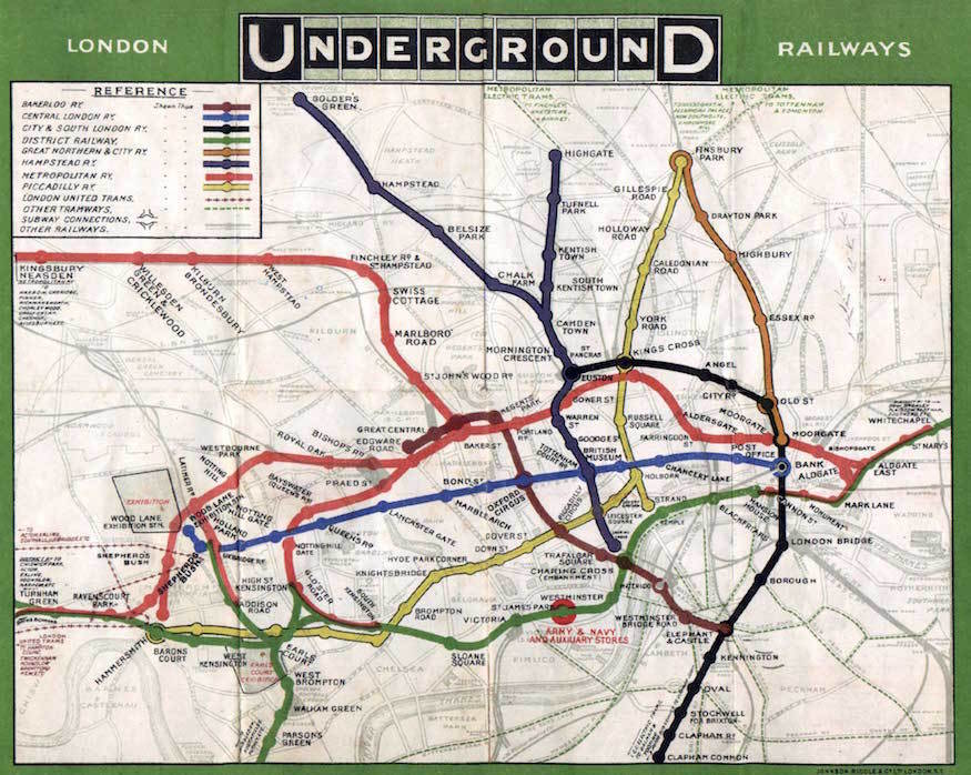 He also linked the bureacractic incompetence of well-connected duffers (something that would never happen in government now, of course) to the "Hotel Cecil" cabinet, stuffed full of relatives of Prime Minister Lord Salisbury, the man from whom we have the phrase "Bob's your uncle." He also linked the stories to other real events in the time they were written or published: the first Official Secrets Act (1889), which was a response to internal carelessness not external threat; the signing of the Entente Cordial in 1904; the coming together of train companies in 1907 which resulted in the first consolidated map of the London Underground network in 1908. Matching story to map shows the all-important journey is from one triangle of lines on the left to a triangle of lines on the right. In these stories, he suggested, we could see a changing relationship to Europe - particularly Germany - in the years preceding the war.