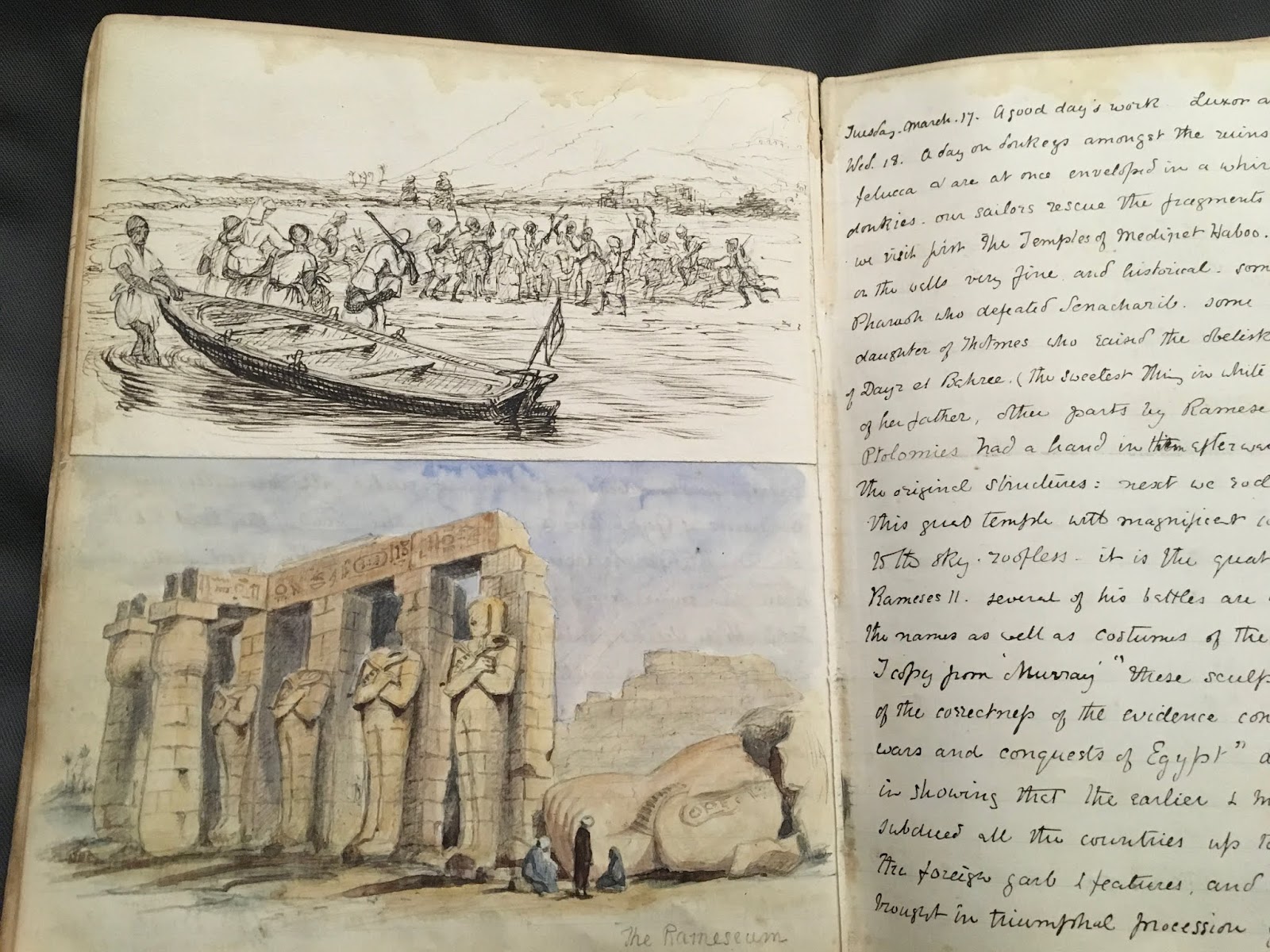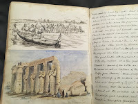 As Gaschke tells us, Lear - like many of his contemporaries - was interested in the picturesque and historical, and ignored signs of modernisation such as the new steam-powered boats. Instead, there are lots of sailed boats sitting quietly on the water, serene and bewitching. (I'm glad to see sketches of the dahabeeh he travelled on - the same kind of vessel hired by Marianne Brocklehurst in the 1870s, about which I'm making a documentary.)