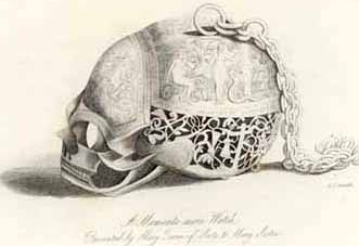 The curious relic, of which we herewith give an engraving, was presented by Mary, Queen of Scots, to her Maid of Honour, Mary Seaton, of the house of Wintoun, one of the four celebrated Maries, who were Maids of Honour to her Majesty."Yestreen the Queen had four Maries,[Illustration [++] Memento-Mori Watch.] [SG: I assume this is a version of the Charles John Smith engraving.]