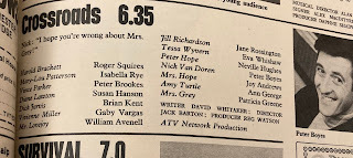 The TV Times listings usually include a line of dialogue from the episode in question, instead of precis or recap (which might spoil the plot). This gives some flavour of the drama. What's more, the lines of dialogue seem to be from the opening moments of each episode. That meant I could relatively easily match the listings printed in TV Times with the soundtrack of an otherwise missing episode - part of a cache of 1960s episodes of Crossroads on the Internet Archive - and show it was one written by David.