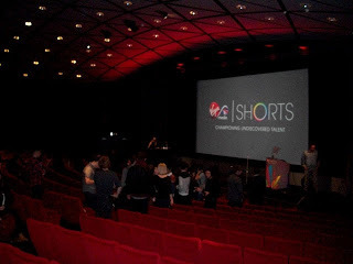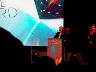 Danny Wallace did the hosting, and Tom was called down with the other directors to receive a fancy, framed version of the poster for our film. The nice lady in green is Jennifer Sheridan who won the competition with her splendid film, Rocket .