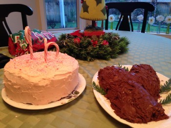 The one on the right is a yule log. Raspberry filling, chocolate chip icing.