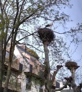 I've been to most of the stops on the Alsatian border of the Rhine, but there's always something missed. What I remember is ancient castles, medieval castles, the big unruly nests of storks on platforms high over the houses. I remember the Vosges Mountains in the distance, and that the Ill river conjoins with the Rhine at Strasbourg somewhere near the European Parliament building. There's an unfinished cathedral there in Strasbourg, with a missing spire, and inside the cathedral, a huge astronomical clock with hundreds of moving parts. I stood and watched that clock for most of an hour. I remember the half-timbered architecture and the good sauerkraut and sausages I had there.
