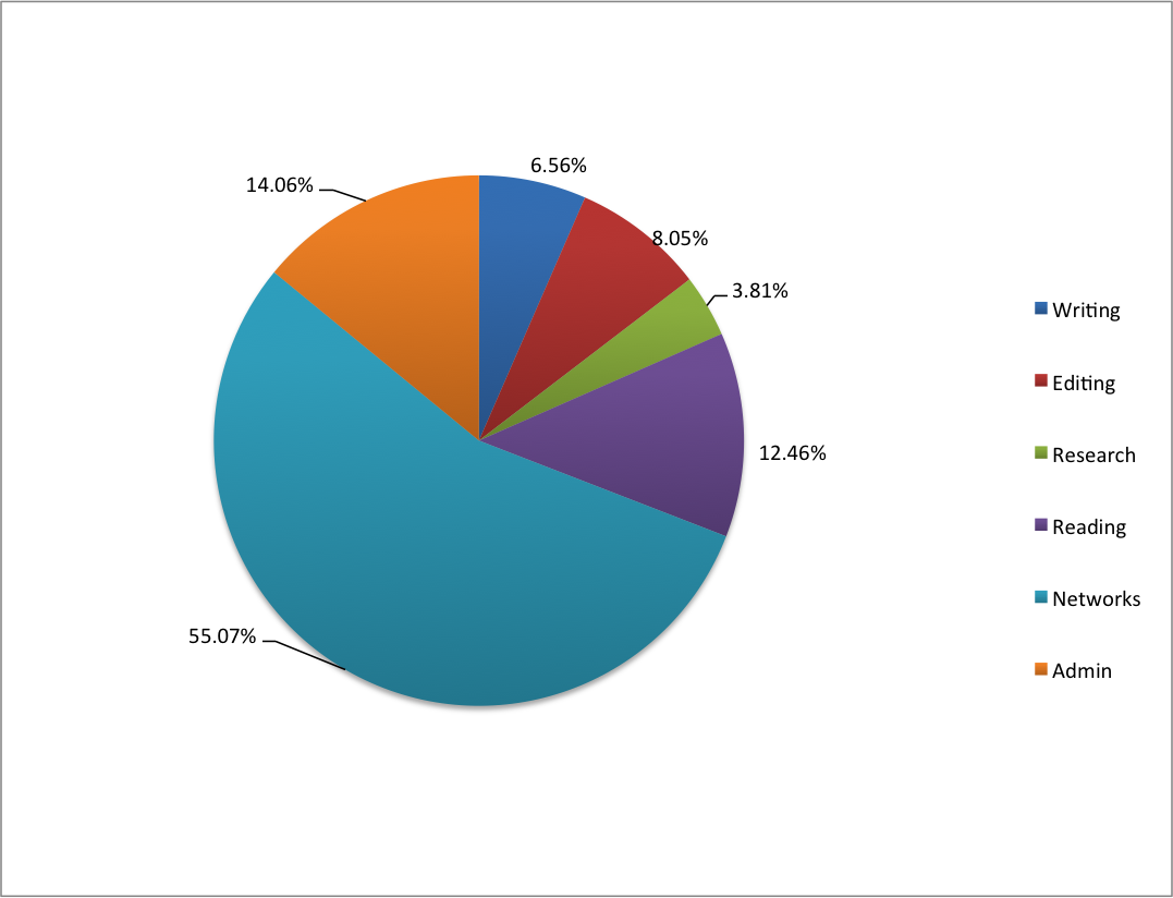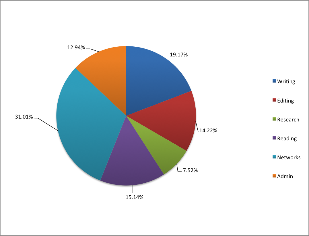 The chart, explained: Writing - initial creation of stories, blog posts, reviews and longer works.Editing - polishing of all written work to make it suitable for readers.Research - discovery of info for story content, market research, contests and blog posts.Reading - books and writing magazines.Networking - emails, Twitter, Pinterest, Facebook, LinkedIn, Google+, and comments.