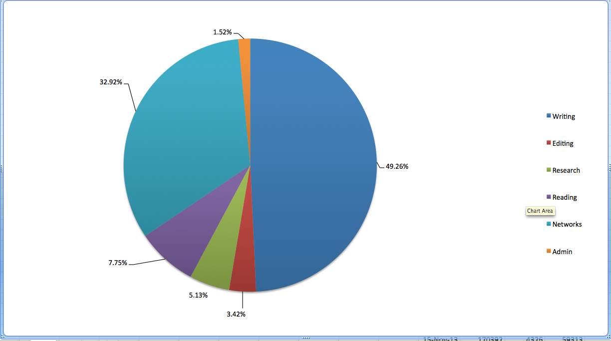 The pie chart shows how my time has been spread over the month. I urge you to do something similar, especially if you have a tendency to procrastinate; and what writer doesn’t? Keeping a record of time spent on the various aspects of your writing activities can be surprisingly informative and sometimes a little alarming!Related articles