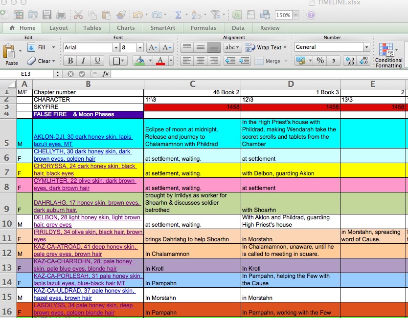A Screen capture of part of the timeline.Regular readers will know that I've been talking about my adult epic fantasy trilogy for some time now. I've written books 1 and 2 and both are now fully edited. I'm currently seeking a publisher for the series.Meanwhile, I started to write book 3. I got as far as the end of chapter 2, around 7,000 words, before I realised I hadn't prepared the absolutely essential tool to aid in keeping track of my many named characters. I devised a timeline so that I'd know exactly where every named character was at any time and what they were doing. This is a necessary tool, as the story takes the form of three interwoven threads, combining to form the plot. Of course, both the time period and the selection of characters change with each book. Some of the players die, some merely fall off the edge of the stage, perhaps to be allowed back up to perform some other part before the end. The timescale is over three years and a great deal happens.