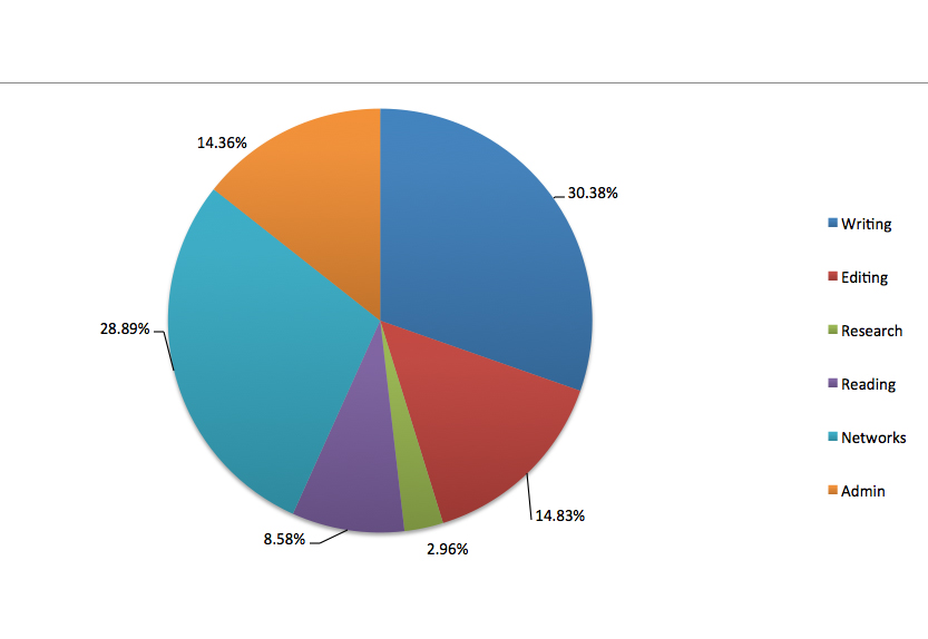 The chart, explained: 'Writing' - initial creation of stories, blog posts, reviews and longer works.'Editing' - polishing of all written work to make it suitable for readers.'Research' - discovery of info for story content, market research, contests and blog posts.'Reading' - books and writing magazines.'Networking' - emails, Twitter, Pinterest, Facebook, LinkedIn, Google+, and comments.'Admin' - story submission, blog posting, marketing, organisation, tax, and general admin tasks.
