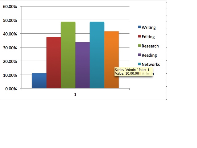 The chart, explained: 'Writing' - initial creation of stories, blog posts, reviews and longer works.'Editing' - polishing of all written work to make it suitable for readers.'Research' - discovery of info for story content, market research, contests and blog posts.'Reading' - books and writing magazines.'Networking' - emails, Twitter, Pinterest, Facebook, LinkedIn and Google+activity.
