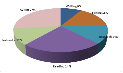 The pie chart, explained: 'Writing' - initial creation of stories, blog posts, reviews and longer works.'Editing' - polishing of all written work to make it suitable for readers.'Research' - discovery of info for story content, market research, contests and blog posts.'Reading' - books and writing magazines.'Networking' - emails, Twitter, Pinterest, Facebook and Google+ activity.'Admin' - story submission, blog posting, marketing, organisation and general admin tasks.