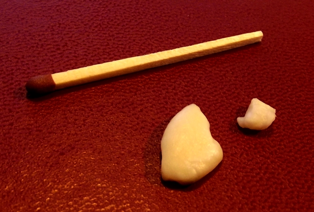 The offending intruder in the joint (matchstick for scale)Watching the images from the camera as it toured my knee joint was fascinating. The obstruction, a piece of bone about the size and shape of an unshelled almond, was located fairly early in the procedure. But the normal route of extraction turned out to be unsuitable, so a third incision was made to give better access and, after 40 minutes on the slab, the offending invader was removed. The surgeon showed me the hole, at the rear of the patella, where the piece of bone had once resided, evident even 19 years after the incident that caused the injury. He cleaned up the rough and damaged surfaces of the cartilage within the joint and on the back surface of the knee cap, flushed out the other small bits of detritus, and sewed up the wounds.Once out of the recovery suite, I was wheeled back to my private room (this is the NHS so such luxury is a treat) and fitted with a surgical stocking to match the one on my ‘good’ leg. These help prevent the dreaded deep vein thrombosis that can afflict older patients, especially following surgery on the legs. As an added precaution, I was provided with five pre-packed injections of anti-coagulant and shown how to inject the first of these into my stomach so I could do the rest over the following days.