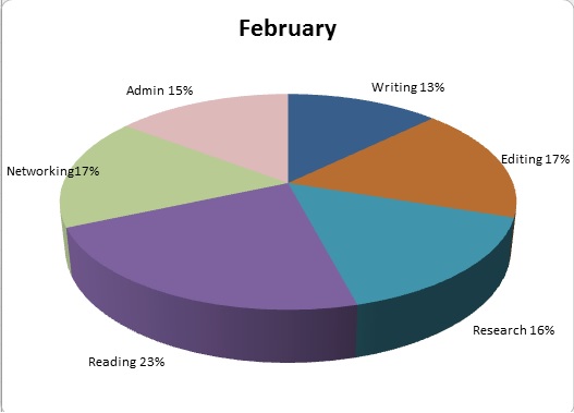 The pie chart, explained: 'Writing' - initial creation of stories, blog posts, reviews and longer works.'Editing' - polishing of all written work to make it suitable for readers.'Research' - discovery of info for story content, market research, contests and blog posts.'Reading' - books and writing magazines.'Networking' - emails, Twitter, Pinterest, Facebook and Google+ activity.'Admin' - story submission, blog posting, marketing, organisation and general admin tasks.