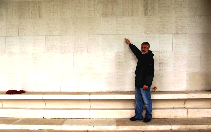 Looking along the Memorial Bays.We visited in September this year on a day when the heavens had decided to weep, the winds to gust fitful and strong. The walk from the railway station, where we’d journeyed from Paris, was wet and wild. It surprised us that there were no directions from there to the monument, but we’d brought maps and found it easily enough. The open fronts of the tall arches occasionally allowed in drenching rain as we sought out the relevant bay where we could find Granddad’s name. But a quick look in the register, housed in a small cabinet, led us where we needed to go. The names are carved into the stone and the years have softened the letters a little so that they blend with the background. But we found Frederick’s name and spent some time in silent contemplation of a life about which we know so little; a life ended too soon in the madness of war.