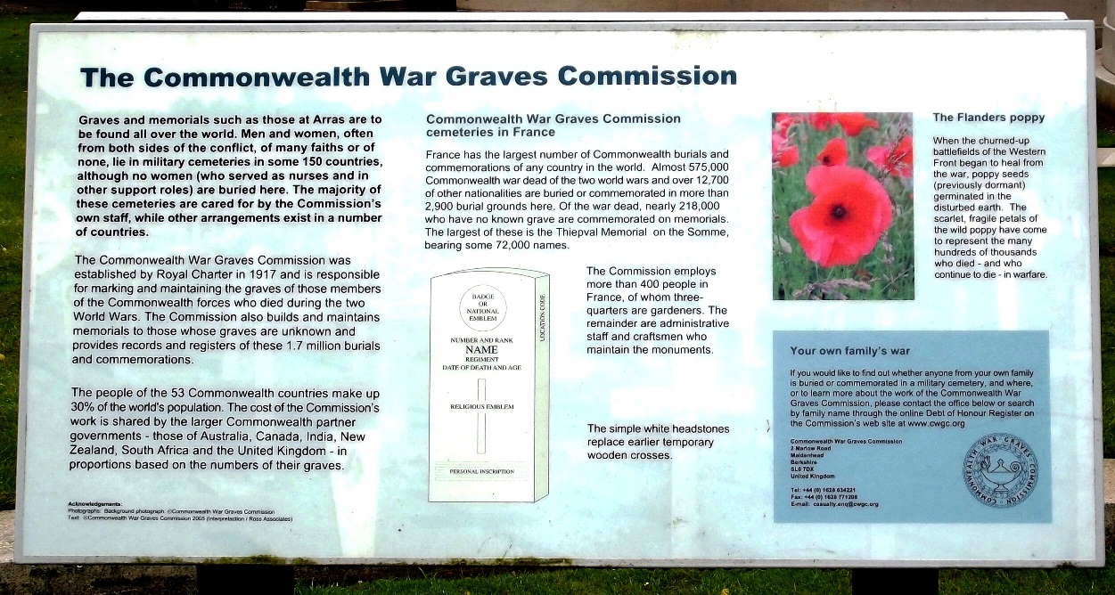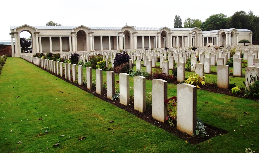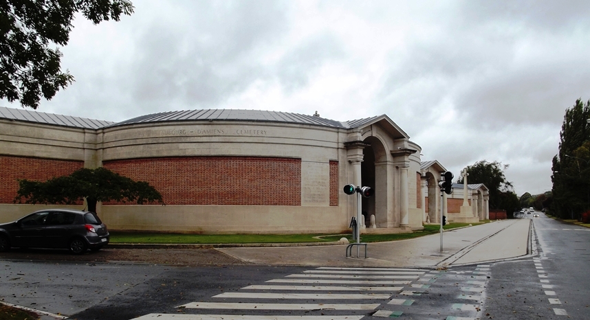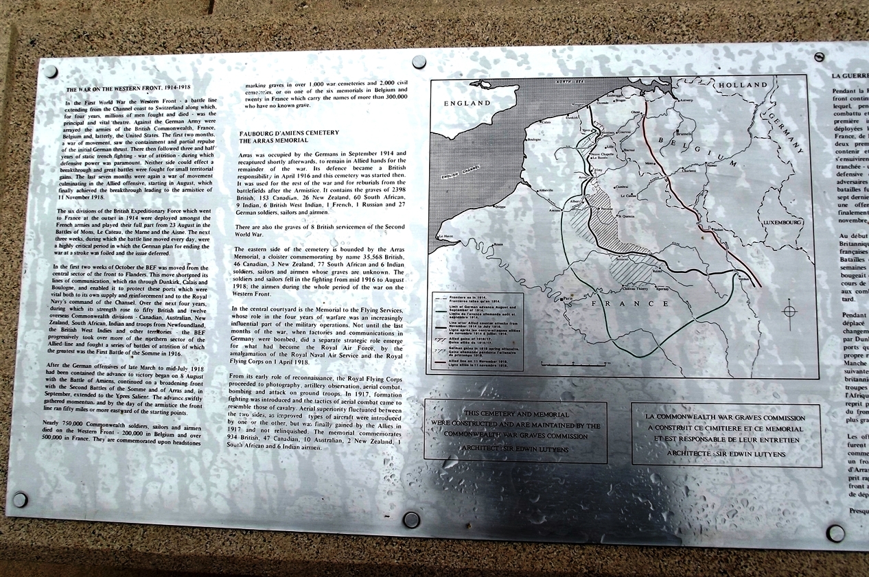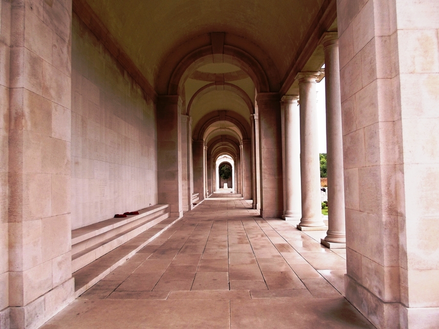 Outside the Monument.The Memorial at Arras bounds the eastern side of the earlier Fauberg D’Amiens Cemetery, where 2,681 servicemen are buried, and records the names of 35,700 servicemen and a further 1,000 airmen, all without known graves. Designed by Sir Edwin Lutyens, and commissioned by the Commonwealth War Graves Commission, the Memorial itself is an austere, sober, but rather beautiful stone monument to all these deaths.