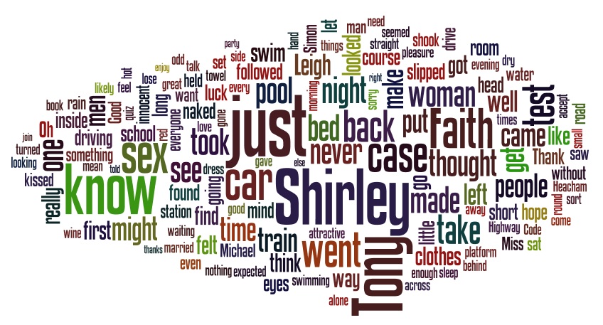 Here are your results... Word Frequency just 25 I’d 21 know 20 Shirley 20 it’ 19 you’re 18 sex 17 Tony 17 car 16 very 15 ‘I 15 you’ 15 I’m 15 Faith 14 case 14 don’t 14 go 13 test 13 time 13 back 13 went 13 look 13 down 12 take 12 one 12
