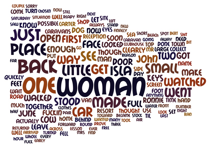 The picture is a Wordle image of Chapter 20. It's interesting that 'Isla' appears quite a lot in this chapter. The story is narrated from Mel's pov, in first person, so his name only appears when someone calls him by it. And the 'love' and 'make' should give some indication of the romantic element here.