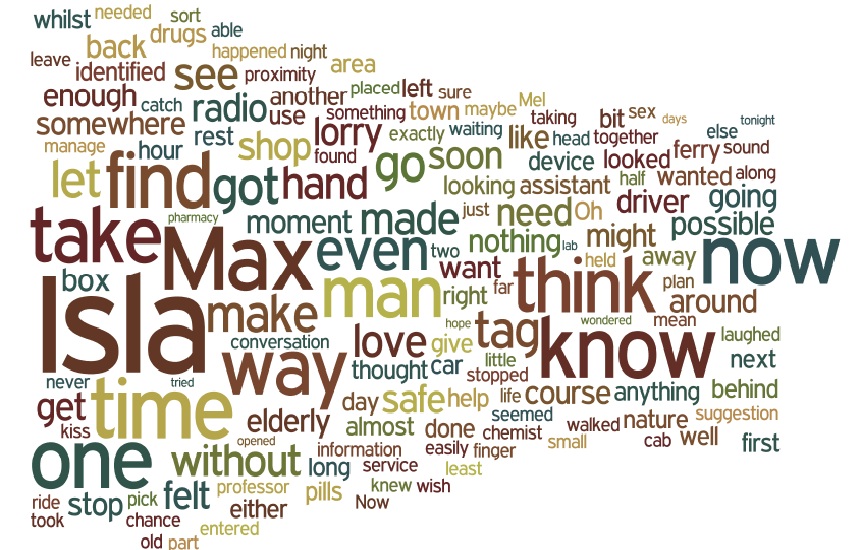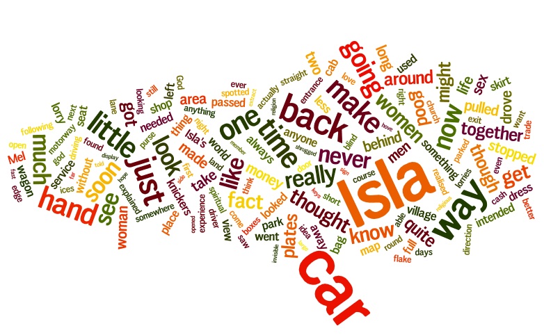 The pic is a Wordle diagram of the latest complete chap, Chapter 18, and the prominence of the word, 'car' indicates how much travelling is going on at present.