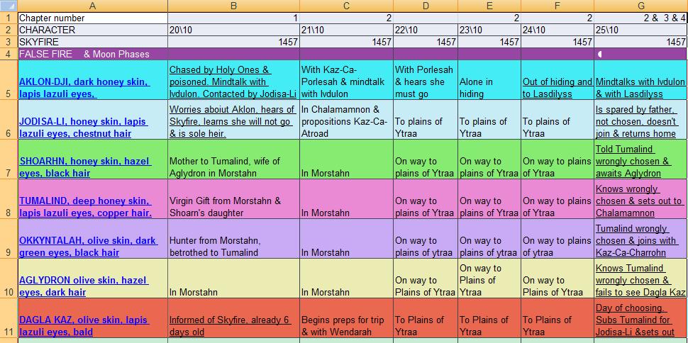 In order to know where everyone is at any given time during the three years of the complete story, I had to develop a comprehensive timeline. Using Excel, I've listed the characters down one side and drawn the dated timeline as the horizontal axis. There are phases of the moon, notes as to which chapter each action occurs in and, in the individual cells, notes about what each character is doing on any given date during the story so far.