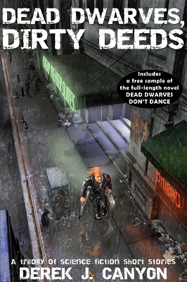 Describing himself as a newbie self-publishing writer, Derek J Canyon was inspired by JA Konrath's success in epublishing. After discovering his blog and reading it for about two days, he decided to dust off an old, rejected manuscript. That novel, Dead Dwarves Don't Dance, is due for release in November.He also had 3 short stories that led up to the novel, and decided to publish them in an anthology, Dead Dwarves, Dirty Deeds, which has been available since September 30th on Amazon.For the last 13 years, his day job has been working as a Technical Writer at Microsoft in the Seattle area. A great place to work, it gives him the financial freedom to pay for cool covers and editing on his ebooks. But, spending all day wracking his brain to write computer documentation does sometimes sap his creativity before he gets home. Alas, one must take the bad with the good. He lives with his wonderful wife Shari and their long-haired chihuahua Andy in the exotic wilderness east of Seattle. Tell us about Dead Dwarves, Dirty Deeds in a few sentences.