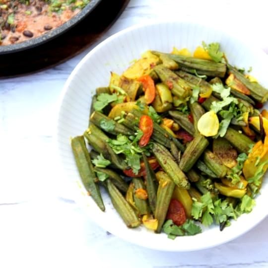 This dish has several names and close cousins –Bhindi Masala or Bhindi Do-Piaza come to mind. But today I am talking Bhindi Jhal Ferazi. After doing this in many authentic steps for a class I never made it again. After several layers of simplification I offer you a sheet pan/air fryer version,