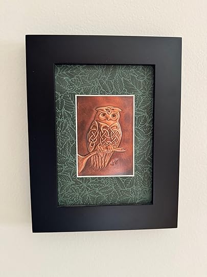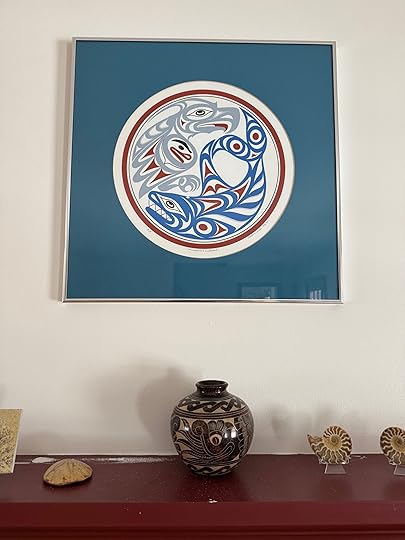 We have a few nice pieces of art that once belonged to my parents. We have photos we purchased just outside of Zion National Park — photos of the park taken by photographer David J. West, with whom we chatted for a time one memorable morning. I have in my office a tiny framed pressed bronze image of a Celtic owl, which I love. And I have yet another signed photo print, this one by renowned nature photographer Larry Ulrich. It was a gift from my siblings for my 50th birthday. And we have a signed print from a Native American artist in the Pacific Northwest that we bought while on our honeymoon in Victoria, British Columbia. This print has hung over the mantel in every home Nancy and I have shared. It was the first piece we put up in the new house.