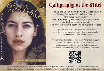 To celebrate the paperback release of Calligraphy of the Witch I will be doing a reading & book signing at ChimMaya Art Gallery (5283 E. Beverly Blvd, Los Angeles CA 90022) on December 9 from 2-4pm. One of the things I most like about the paperback (other than my darling wife's cover, of course) is the way Marina, Gabi, and Nick at Arte Publico Press made the influence of Sor Juana Inés de la Cruz, on the book and on the main character's life, front and center. The story could be described as Sor Juana meets the Salem witch trials, although it's her assistant Concepción who embodies the poetry and philosophy of la décima Musa in New England. This is the flyer that Alma created for the event. Note the nifty code box that can be scanned by a phone or Ipad and it will take you directly to my website. So cool.
