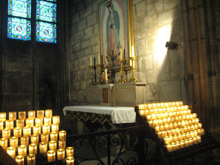 The Mass is ending at Notre Dame. We found la Guadalupana here, resplendent in her own nicho with a jeweled crown on her head and candle offerings with her image stamped on the cup. She's the only Virgin we've seen with her own line of candles. This is how great Paris has been so far. Yesterday I proposed (again) on the Eiffel Tower and today we said vows of love and gratitude to each other during the mass at Notre Dame. Our wedding in California isn't until August, but it feels as though, in another lifetime, we must have sat in this cathedral before, perhaps married each other for the first time in this very spot, the nave filled with the smoke of incense and the voice of an angel singing blessings over our heads. I sit here writing and Alma draws another Virgin in watercolor hues.